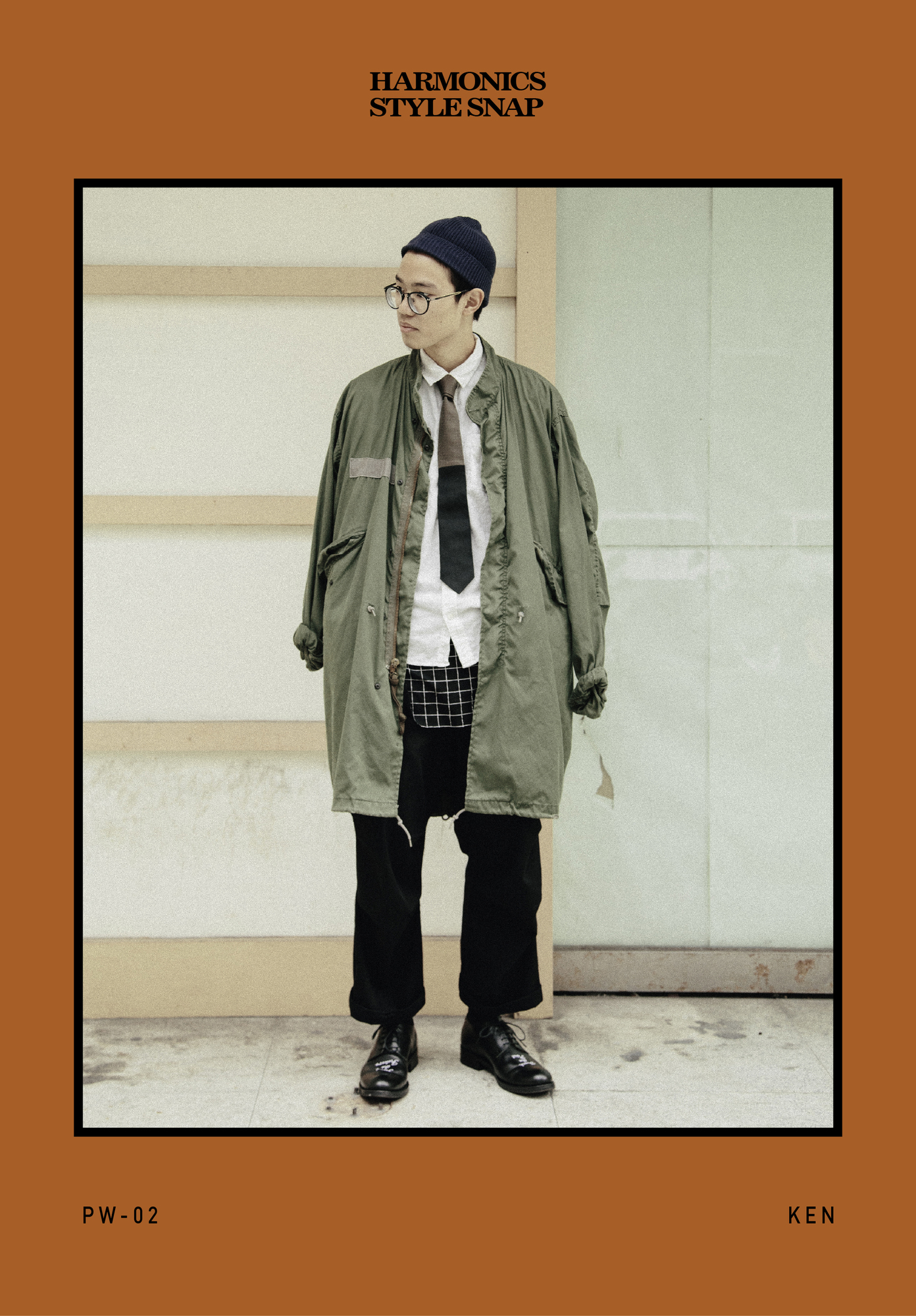 很開心這次也邀請到任職於線上流行雜誌Overdope的Ken,這次全身皆是選用軍品味道的單品來搭配,上身軍綠與下身全黑的配色,特意與PW-02領帶相同的色調搭配方式相當有趣,上身披掛自行改良立領的美軍公發外套,搭配由公發軍褲改良而成自製軍褲,讓整體寬鬆輪廓更加一致,中層也不馬虎,選用長版背心來豐富中層層次,構成相當吸睛的都會軍事造型呈現。