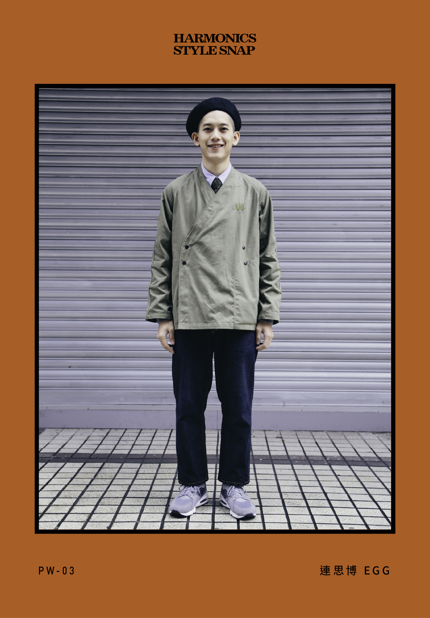 近年來服飾品牌逐漸地將日本傳統服飾元素帶入日常衣著設計中,不管是擷取輪廓或是經典款式再造,許多令人亮眼的衣著單品也為服飾生態注入了新生命,而這次Egg便是挑選了由日本傳統服飾之一的「作務衣」改良外套來搭配領帶,東西式的服裝混搭方式讓人印象深刻,而上下身皆選擇中版略寬的身形來搭配,原色褲及經典球鞋的挑選,也呈現Egg擅長的mix&match風格。出色的街頭搭配給大家做參考。