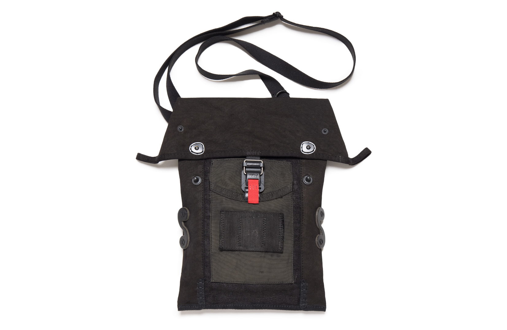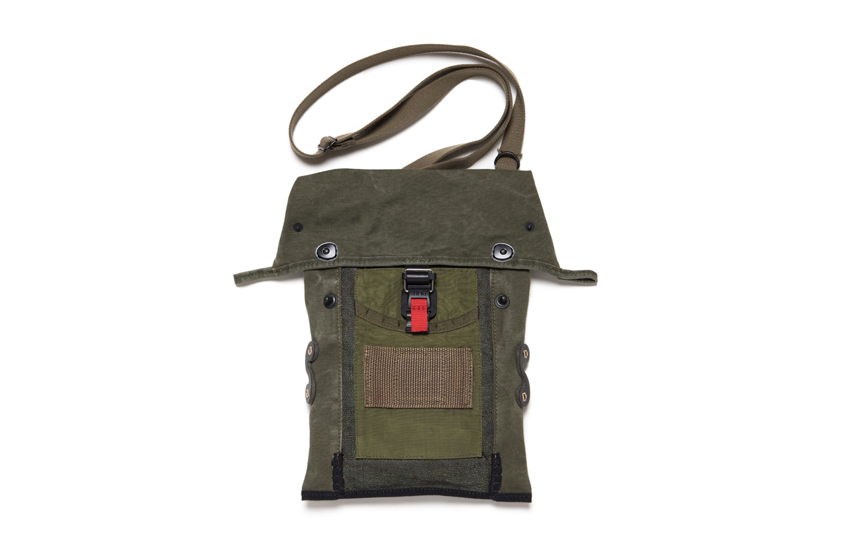 將拆解後的HAVERSACK LOWER PACK作為包件的本體,拼接上後染帳篷麻料,上層再堆疊彈藥袋作為功能性口袋,藉由壓折的設計模式,老軍品的特殊結構進而組成屋型的新型態,下擺採用日本進口環形包邊帶,左右接縫處則以手縫粗線加強固定,上方包蓋搭載德國FILDLOCK快拆扣,雙邊配上軍規龜背扣,能有兩種模式呈現,而後片下擺亦有梅花扣可做調整,包袋兩側手縫上此次聯名LOGO的定製皮片,可掛上各種隨身物件,背帶為可拆卸式的烤漆葫蘆扣,若不做使用,另有提供把手輔助,由於每個包都是單一老品拆解製作,故所呈現的狀態和色澤也將有所不同。包款黑、軍綠兩色推出。