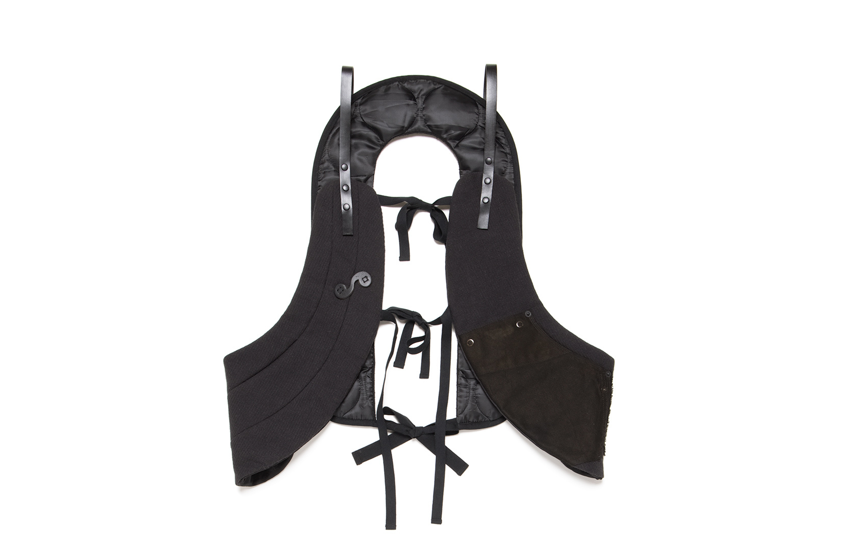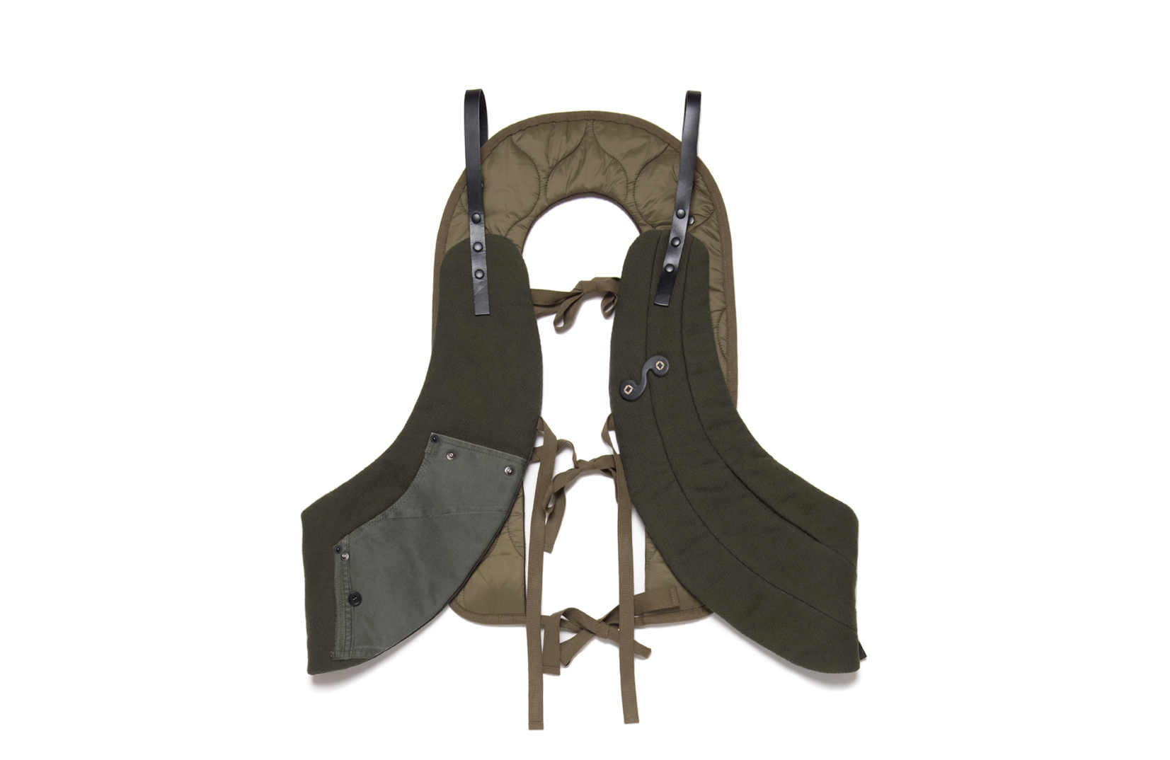 源自KAPOK LIFE VEST的發想,刪去整片且臃腫的型態,進而改良成輕量可拆解的功能性背心,大身採用日本後染捲圈棉布與疙瘩/羊毛厚質纖維材料,將拆解下的ABL BEGETEX MILITARY SHIRT肩片拼製成單邊口袋,亦手縫上此次聯名LOGO的定製皮片,內裏特別設定了左右隱藏口袋,整件背心使用植鞣皮革做為連結,隨著使用時間積累,其表面的色澤也會有所變化,除了可依照喜好做位置上的調整,拆開的背心前片可當側背包或腰包搭配使用,後片的倒U則能獨立作為圍巾來保暖,單品採雙面皆可著用設計,是貫徹一物多用精神的多元單品。