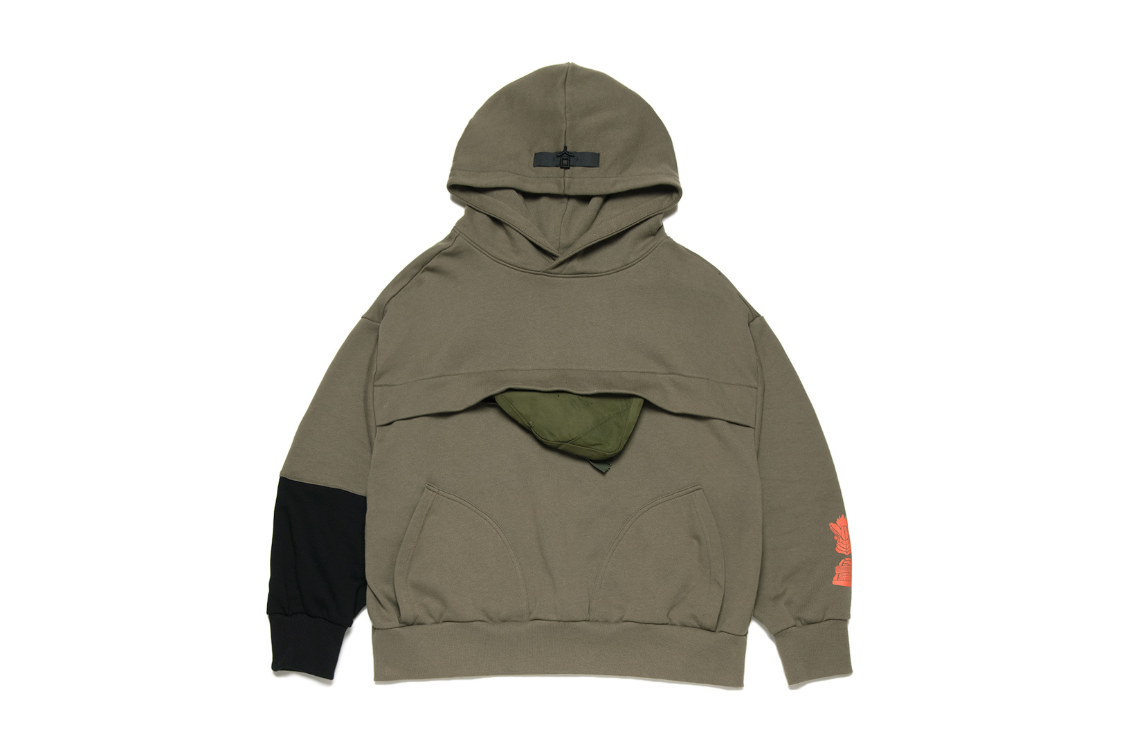 以Anorak登山外套為靈感,呈現新式樣帽TEE,前片配置可拆卸小包,藉由特殊壓釦可自由拆卸,該小包以老式軍品彈藥包改製而成,保留原本軍規編號油印細節,並分別以 IDEAL、HOOKLESS 老拉鍊作為副料製成,保留老式軍品味道並呈現特殊結構。而背面以布色網版印製此次聯名的虛擬軍徽以及標準字,以若有似無的方式呈現印刷細節,手袖則印刷「KIGENA」&「ZIBOT」頭像。而外觀分別以古著帽tee細節Lock Hood以及雙色拼接袖呈現左右不對稱的外觀設計,整體短板寬鬆剪裁,分別以黑、綠兩色推出。