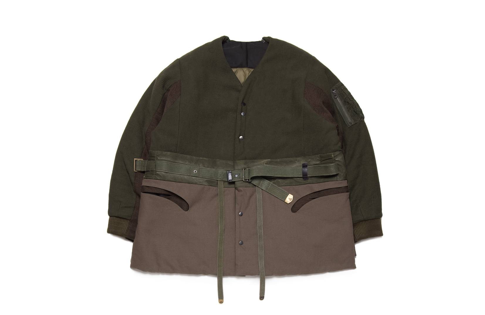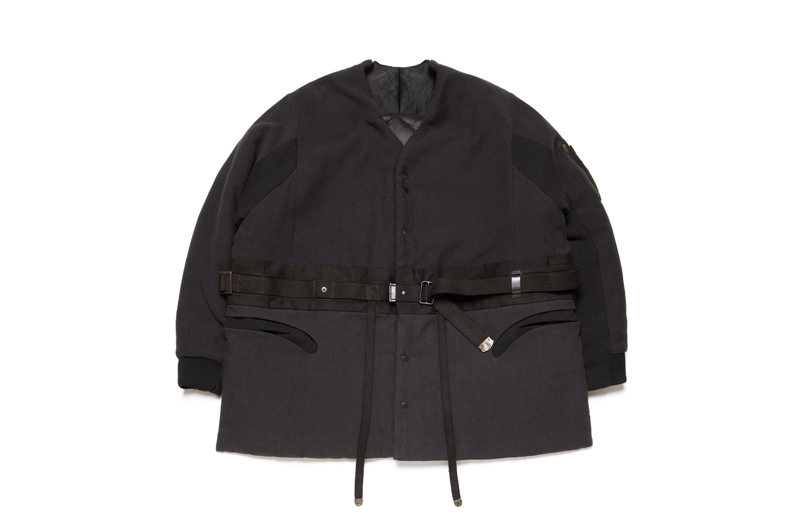 外套本身擁有多種玩味性的著用模式,除了基本的單排釦固定方式外,兩條延伸的軍用條帶可相互打結,依照自身穿搭來做變化。另外,剪接腰帶亦有其用途,將前端梅花釦分別固定於織帶中段,左右襟皆可互釦,展現日式和服美學;而左腰較長的軍用織帶可抽出延伸繞至右邊扣具上,使整體形態上有明顯修身效果。整件最特別的設定在於後片的兩組軍用調節日字釦,可與前片條帶做固定,拉開肩線拉鍊並拆開脇邊下擺後,即反轉為蓬鬆誇大的戰鬥背心,推薦給喜愛感受各種細節的朋友。